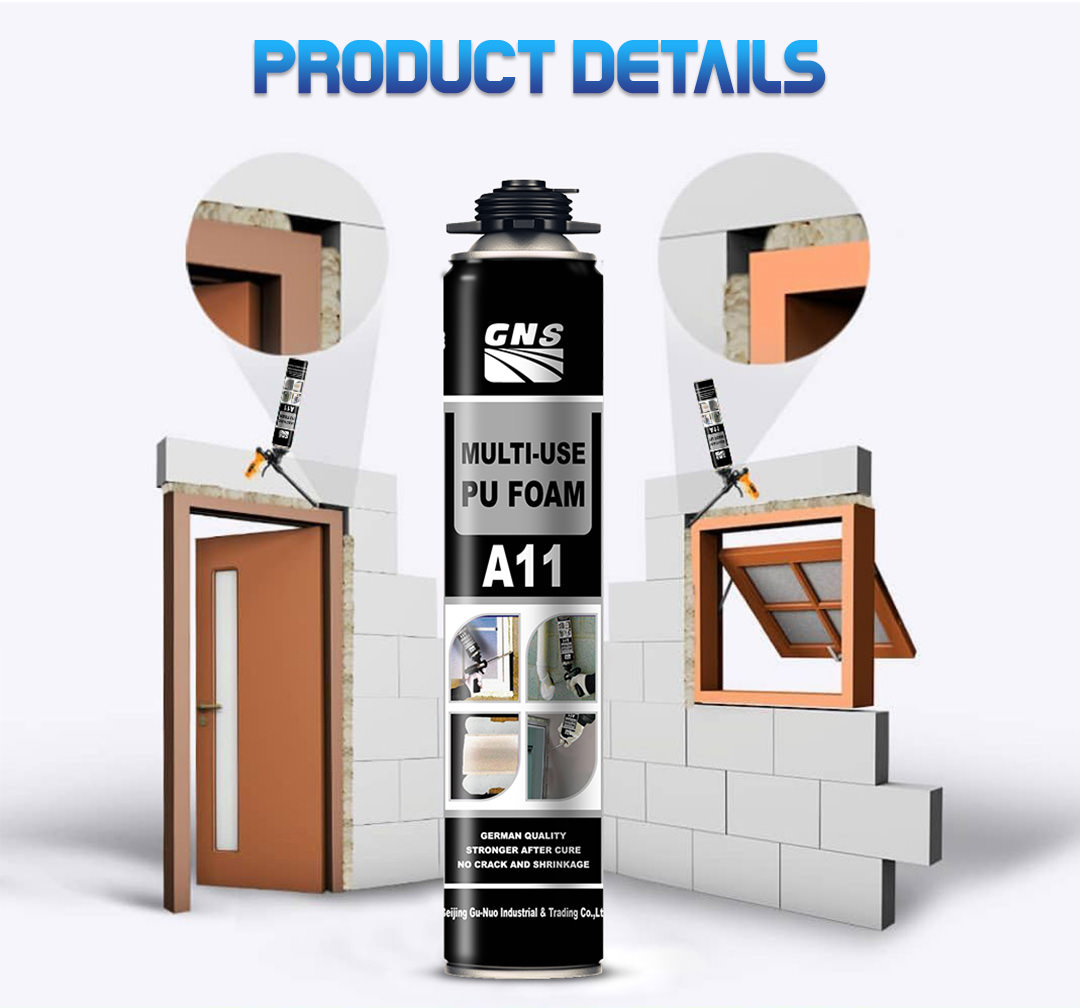 Product Features:Multi Purpose PU Foam Gun Type A11 is an one-component, high quality multi-purpose polyurethane foam. It is fitted with a plastic adapted head for use with a foam application gun. The foam will expand and cure by moisture in the air. It is designed for sealing and sealing imperfections, installation of construction components, high sound and thermal insulation, and various other repair and construction tasks.